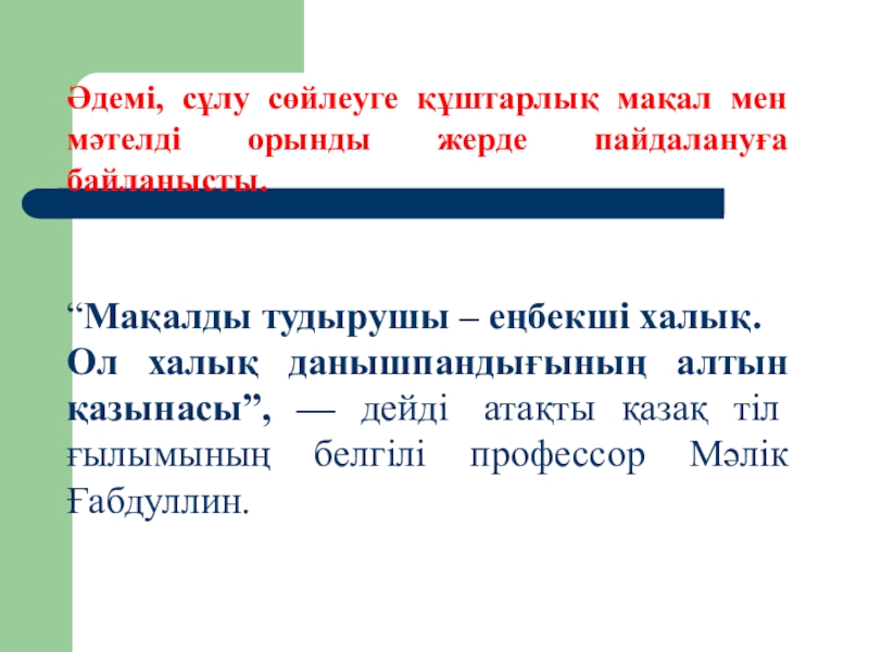 Слайд 16Әдемі, сұлу сөйлеуге құштарлық мақал мен мәтелді орынды жерде пайдалануға байланысты.