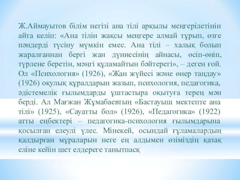 жақсы меңгере алмай тұрып, өзге пәндерді түсіну мүмкін емес. Ана тілі – халық болып жаралғаннан бергі жан дүниесінің айнасы, өсіп-өніп, түрлене беретін, мәңгі құламайтын бәйтерегі», – деген ғой. Ол «Психология» (1926), «Жан жүйесі және өнер таңдау» (1926) оқулық құралдарын жазып, психология, педагогика, әдістемелік ғылымдарды ұштастыра оқытуға терең мән берді. Ал Мағжан Жұмабаевтың «Бастауыш мектепте ана тілі» (1925), «Сауатты бол» (1926), «Педагогика» (1922) атты еңбектері – педагогика-психология ғылымдарына қосылған елеулі үлес. Мінекей, осындай ғұламалардың қалдырған мұраларын неге ең алдымен өзіміздің қазақ еліне кейін шет елдереге танытпасқа.