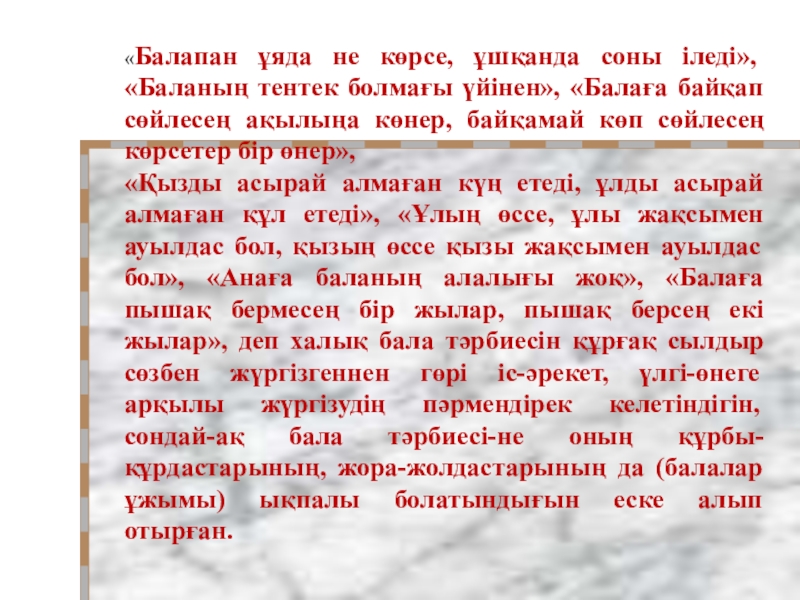 Слайд 33«Балапан ұяда не көрсе, ұшқанда соны іледі», «Баланың тентек болмағы үйінен»,