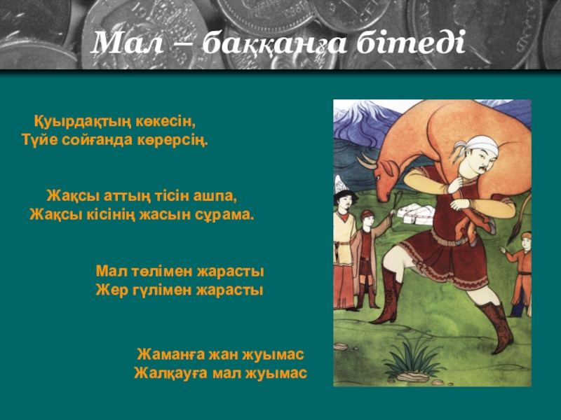 Слайд 10Қазақ халқы мақал мен мәтелге бай халық. Халықтың мақалдары мен мәтелдерін
