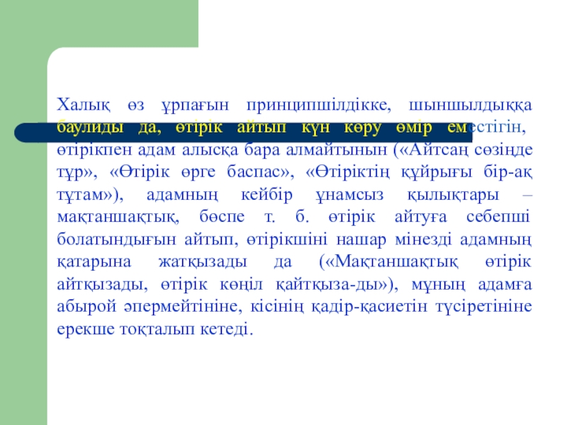 Слайд 21Халық өз ұрпағын принципшілдікке, шыншылдыққа баулиды да, өтірік айтып күн көру