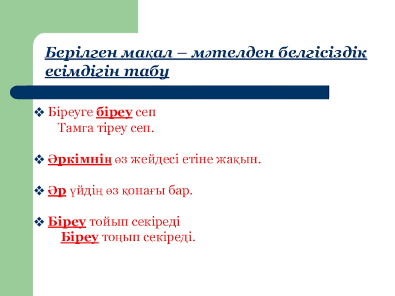 Слайд 37Берілген мақал – мәтелден белгісіздік