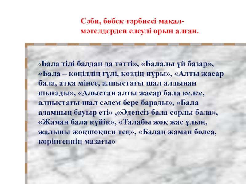 Слайд 31«Бала тілі балдан да тәтті», «Балалы үй базар», «Бала – көңілдің