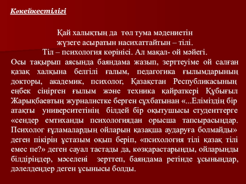 Осы тақырып аясында баяндама жазып, зерттеуіме ой салған қазақ халқына белгілі ғалым, педагогика ғылымдарының докторы, академик, психолог, Қазақстан Республикасының еңбек сіңірген ғылым және техника қайраткері Құбығыл Жарықбаевтың журналистке берген сұхбатынан «...Еліміздің бір атақты университетінің білдей бір оқытушысы студенттерге «сендер емтиханды психологиядан орысша тапсырасыңдар. Психолог ғұламалардың ойларын қазақша аударуға болмайды» деген пікірін ұстазым оқып беріп, «психология тілі қазақ тілі емес пе?» деген сауал тастады да, көзқарастарыңды, ойларыңды білдіріңдер, мәселені зерттеп, баяндама ретінде ұсыныңдар, дәлелдеңдер деген ұсынысы болды.