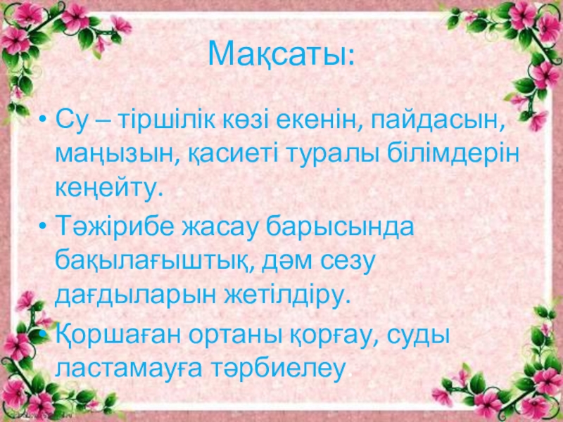 Мақсаты:Су ‒ тіршілік көзі екенін, пайдасын, маңызын, қасиеті туралы білімдерін кеңейту.Тәжірибе жасау барысында бақылағыштық, дәм сезу дағдыларын