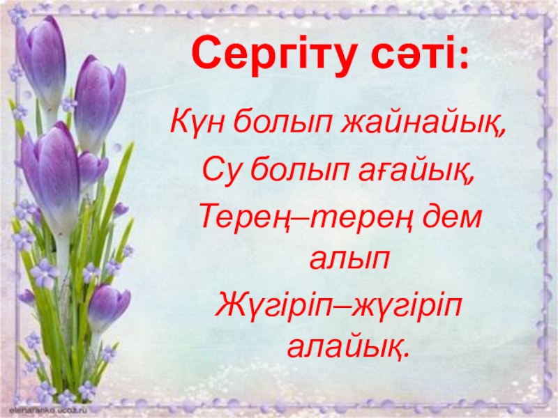 Сергіту сәті:Күн болып жайнайық,Су болып ағайық,Терең‒терең дем алыпЖүгіріп‒жүгіріп алайық.