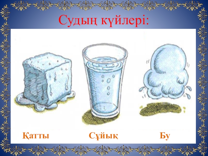 Түсінеді: Судың күйлерін: (қатты, сұйық, буды).