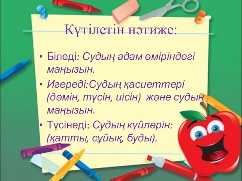 Күтілетін нәтиже:Біледі: Судың адам өміріндегі маңызын.Игереді:Судың қасиеттері (дәмін, түсін, иісін) және судың маңызын.Түсінеді: Судың күйлерін: (қатты, сұйық,