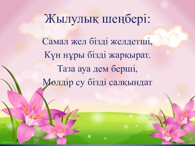 Жылулық шеңбері:Самал жел бізді желдетші,Күн нұры бізді жарқырат.Таза ауа дем берші,Мөлдір су бізді салқындат