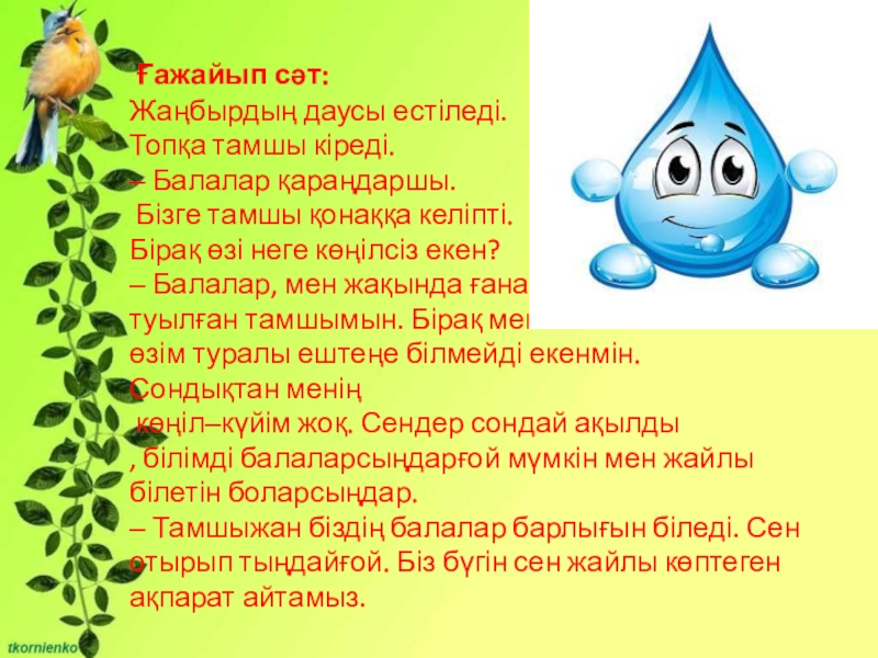 қонаққа келіпті. Бірақ өзі неге көңілсіз екен? ‒ Балалар, мен жақында ғана туылған тамшымын. Бірақ мен өзім туралы ештеңе білмейді екенмін. Сондықтан менің көңіл‒күйім жоқ. Сендер сондай ақылды , білімді балаларсыңдарғой мүмкін мен жайлы білетін боларсыңдар. ‒ Тамшыжан біздің балалар барлығын біледі. Сен отырып тыңдайғой. Біз бүгін сен жайлы көптеген ақпарат айтамыз.