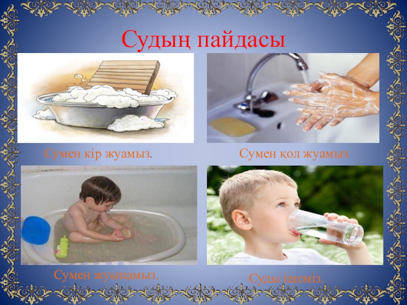 Судың пайдасыСумен кір жуамыз.Сумен қол жуамызСумен жуынамыз.Суды ішеміз.