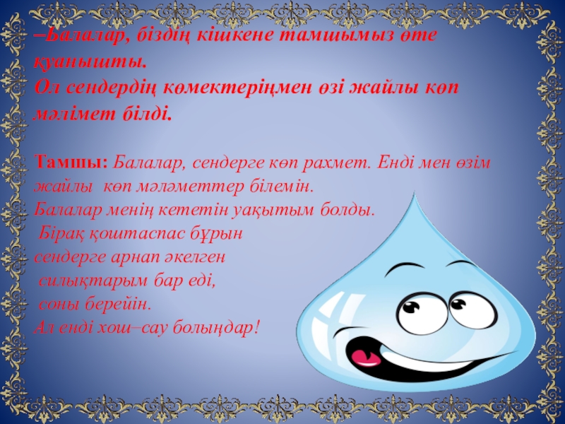 Слайд 10‒Балалар, біздің кішкене тамшымыз өте қуанышты. Ол сендердің көмектеріңмен өзі жайлы көп