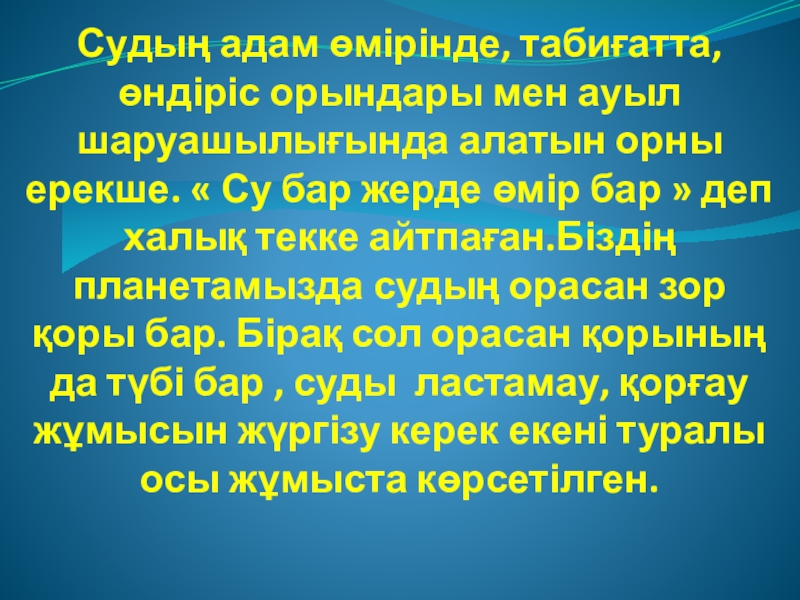 ерекше. « Су бар жерде өмір бар » деп халық текке айтпаған.Біздің планетамызда судың орасан зор қоры бар. Бірақ сол орасан қорының да түбі бар , суды ластамау, қорғау жұмысын жүргізу керек екені туралы осы жұмыста көрсетілген.