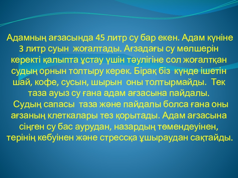 Слайд 17Адамның ағзасында 45 литр су бар екен. Адам күніне 3 литр