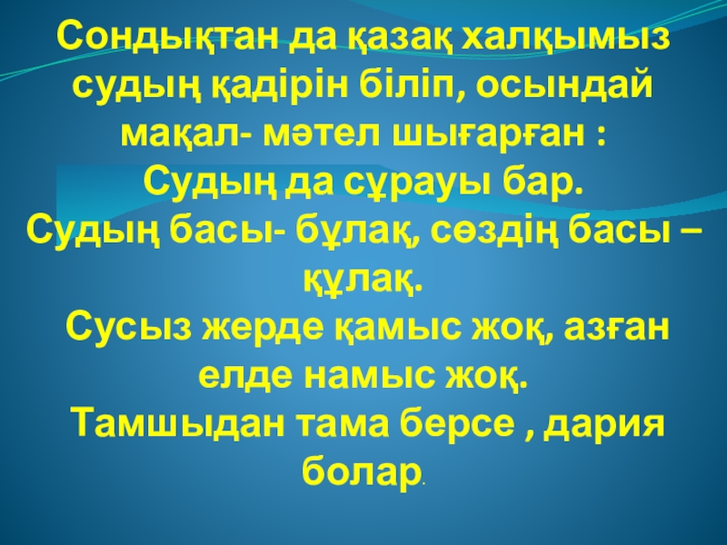 Слайд 10Сондықтан да қазақ халқымыз судың қадірін біліп, осындай мақал- мәтел шығарған