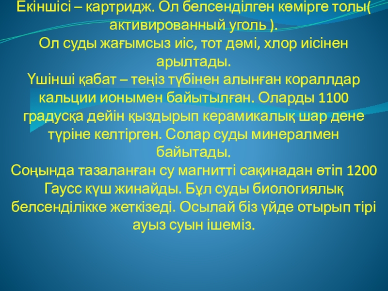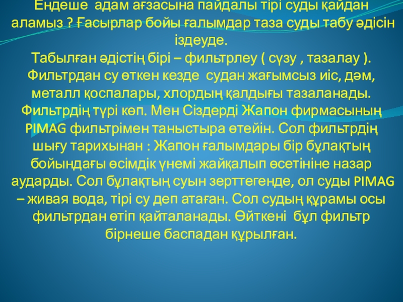 Фильтрдің түрі көп. Мен Сіздерді Жапон фирмасының PIMAG фильтрімен таныстыра өтейін. Сол фильтрдің шығу тарихынан : Жапон ғалымдары бір бұлақтың бойындағы өсімдік үнемі жайқалып өсетініне назар аударды. Сол бұлақтың суын зерттегенде, ол суды PIMAG – живая вода, тірі су деп атаған. Сол судың құрамы осы фильтрдан өтіп қайталанады. Өйткені бұл фильтр бірнеше баспадан құрылған.
