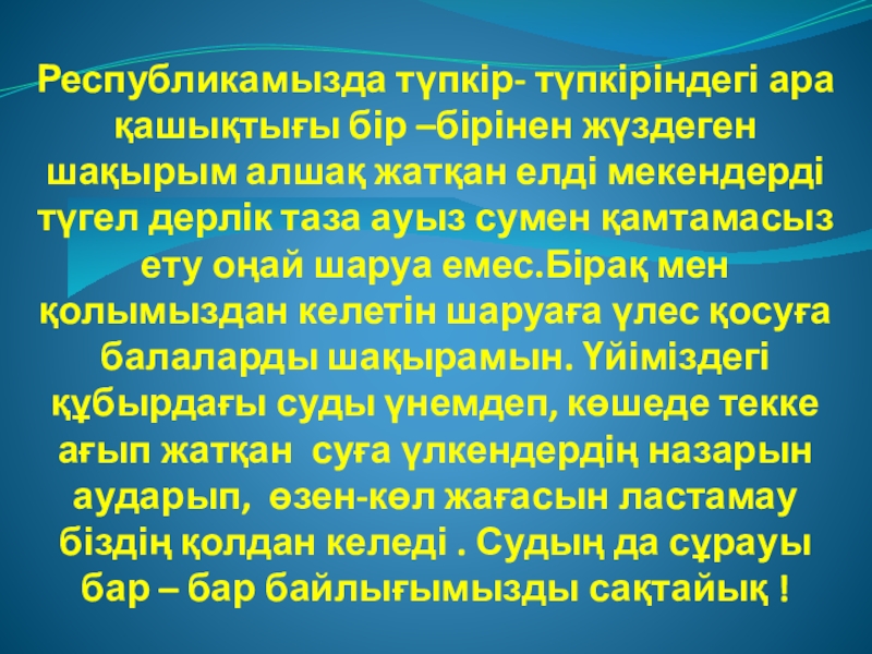 елді мекендерді түгел дерлік таза ауыз сумен қамтамасыз ету оңай шаруа емес.Бірақ мен қолымыздан келетін шаруаға үлес қосуға балаларды шақырамын. Үйіміздегі құбырдағы суды үнемдеп, көшеде текке ағып жатқан суға үлкендердің назарын аударып, өзен-көл жағасын ластамау біздің қолдан келеді . Судың да сұрауы бар – бар байлығымызды сақтайық !