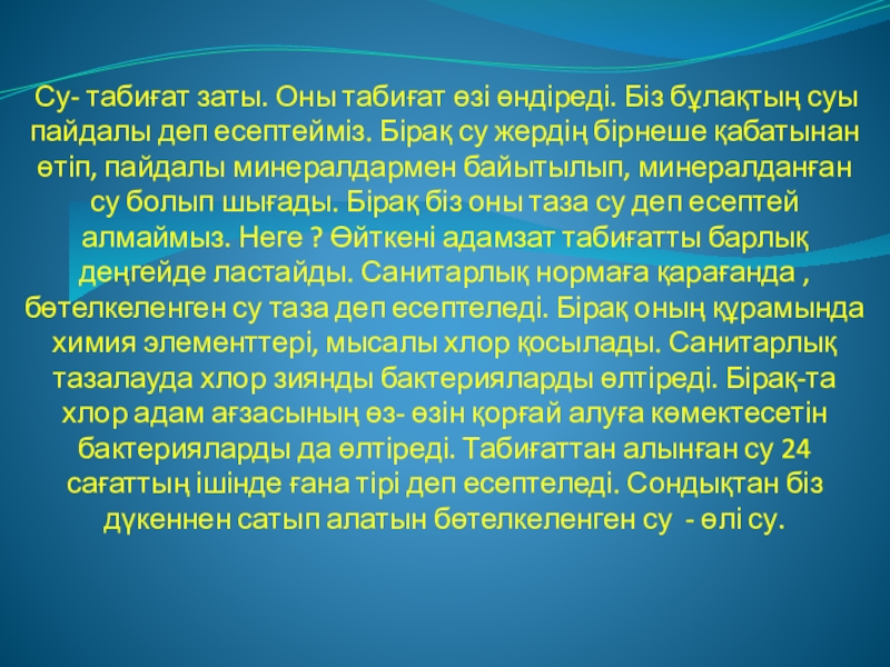 пайдалы деп есептейміз. Бірақ су жердің бірнеше қабатынан өтіп, пайдалы минералдармен байытылып, минералданған су болып шығады. Бірақ біз оны таза су деп есептей алмаймыз. Неге ? Өйткені адамзат табиғатты барлық деңгейде ластайды. Санитарлық нормаға қарағанда , бөтелкеленген су таза деп есептеледі. Бірақ оның құрамында химия элементтері, мысалы хлор қосылады. Санитарлық тазалауда хлор зиянды бактерияларды өлтіреді. Бірақ-та хлор адам ағзасының өз- өзін қорғай алуға көмектесетін бактерияларды да өлтіреді. Табиғаттан алынған су 24 сағаттың ішінде ғана тірі деп есептеледі. Сондықтан біз дүкеннен сатып алатын бөтелкеленген су - өлі су.