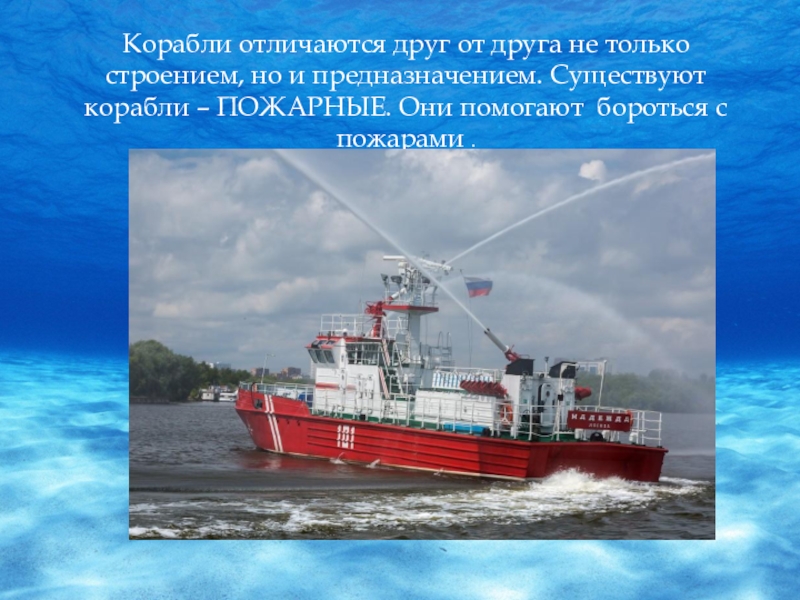 Корабли отличаются друг от друга не только строением, но и предназначением. Существуют корабли – ПОЖАРНЫЕ. Они помогают