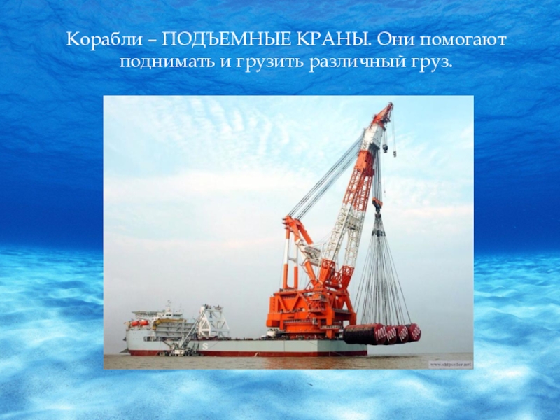 Слайд 15Корабли – ПОДЪЕМНЫЕ КРАНЫ. Они помогают поднимать и грузить различный груз.