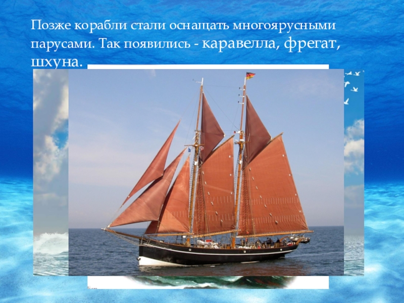 Позже корабли стали оснащать многоярусными парусами. Так появились - каравелла, фрегат, шхуна.