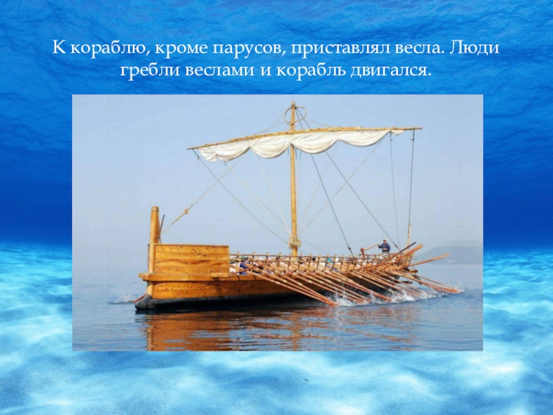 Слайд 6К кораблю, кроме парусов, приставлял весла. Люди гребли веслами и корабль