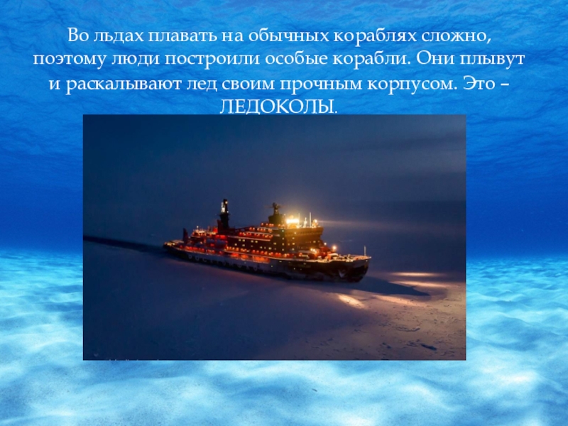 Слайд 12Во льдах плавать на обычных кораблях сложно, поэтому люди построили особые