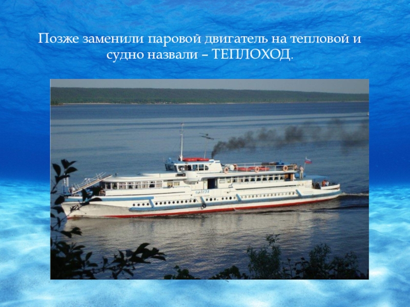 Слайд 10Позже заменили паровой двигатель на тепловой и судно назвали – ТЕПЛОХОД.