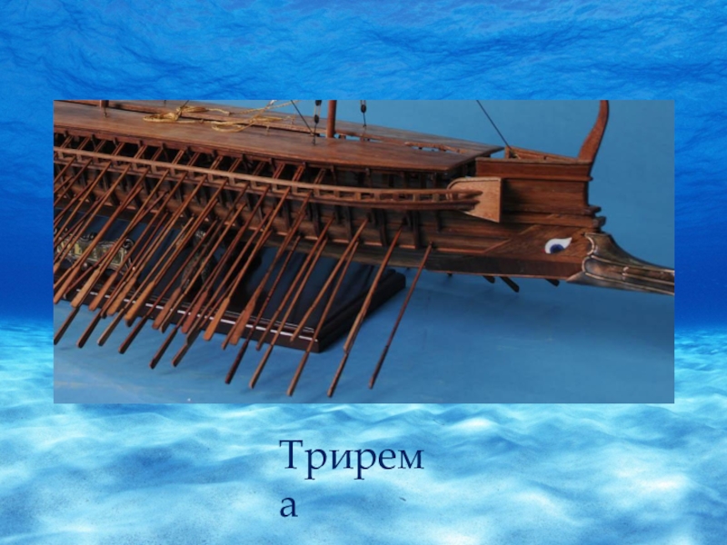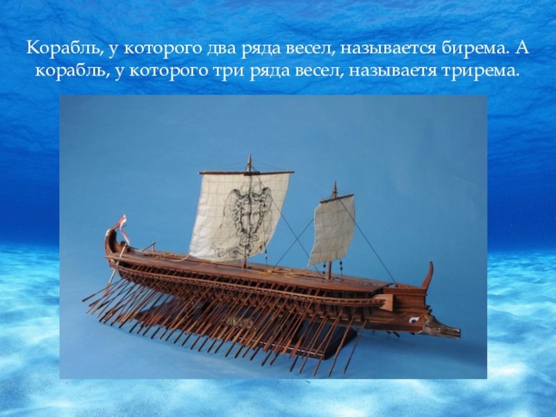 Слайд 7Корабль, у которого два ряда весел, называется бирема. А корабль, у