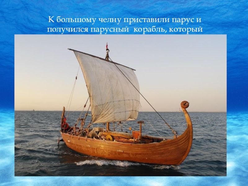 Слайд 5К большому челну приставили парус и получился парусный корабль, который называется