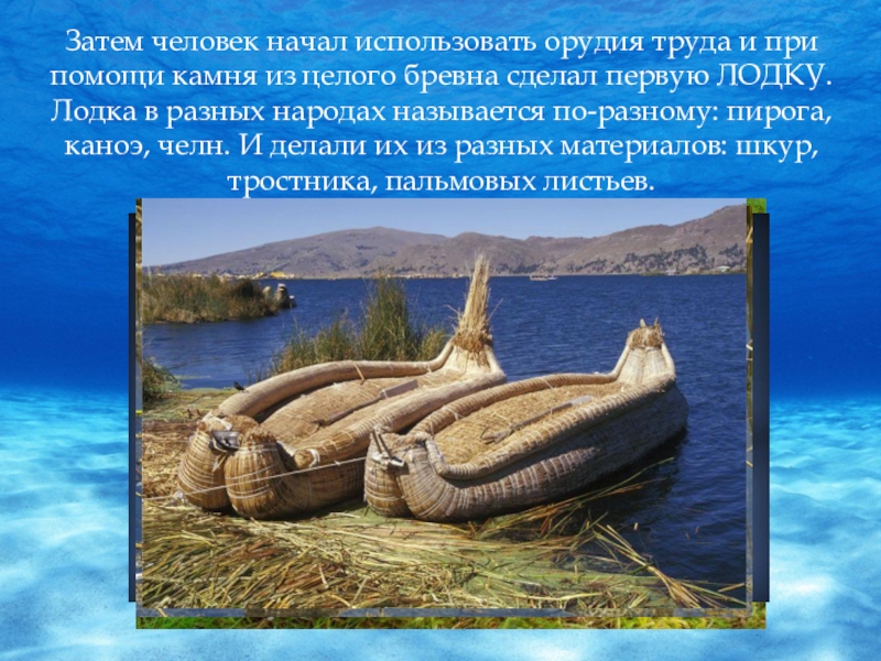 целого бревна сделал первую ЛОДКУ. Лодка в разных народах называется по-разному: пирога, каноэ, челн. И делали их из разных материалов: шкур, тростника, пальмовых листьев.