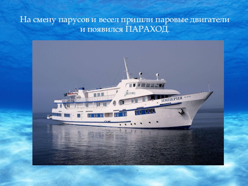 Слайд 9На смену парусов и весел пришли паровые двигатели и появился ПАРАХОД.