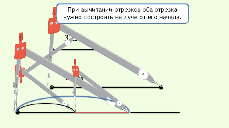 При сложении конец первого отрезка является началом второго отрезка, а при вычитании — оба отрезка имеют общее начало.