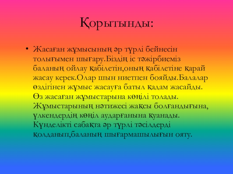Қорытынды:Жасаған жұмысының әр түрлі бейнесін толығымен шығару.Біздің іс тәжірбиеміз баланың ойлау қабілетін,оның қабілетіне қарай жасау керек.Олар шын