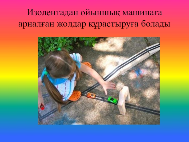 Слайд 26Изолентадан ойыншық машинаға арналған жолдар құрастыруға болады