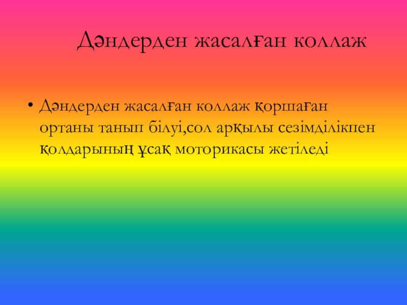 Дәндерден жасалған коллажДәндерден жасалған коллаж қоршаған ортаны танып білуі,сол арқылы сезімділікпен қолдарының ұсақ моторикасы