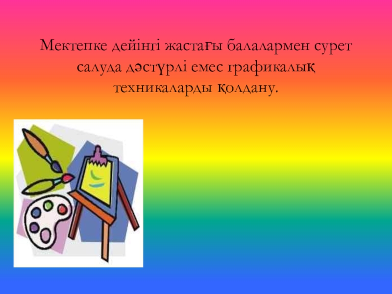 Слайд 1Мектепке дейінгі жастағы балалармен сурет салуда дәстүрлі емес графикалық техникаларды қолдану.