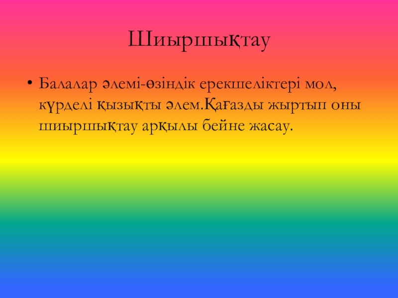 ШиыршықтауБалалар әлемі-өзіндік ерекшеліктері мол,күрделі қызықты әлем.Қағазды жыртып оны шиыршықтау арқылы бейне жасау.