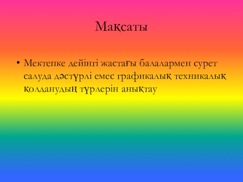МақсатыМектепке дейінгі жастағы балалармен сурет салуда дәстүрлі емес графикалық техникалық қолданудың түрлерін анықтау