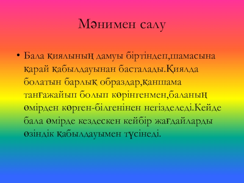 Мәнимен салуБала қиялының дамуы біртіндеп,шамасына қарай қабылдауынан басталады.Қиялда болатын барлық образдар,қаншама танғажайып болып көрінгенмен,баланың өмірден көрген-білгенінен негізделеді.Кейде