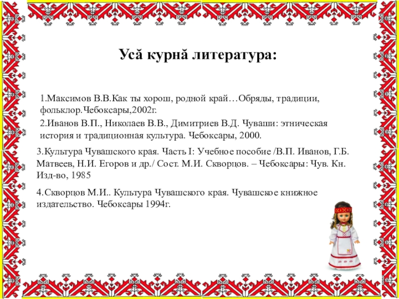 1.Максимов В.В.Как ты хорош, родной край…Обряды, традиции,фольклор.Чебоксары,2002г.