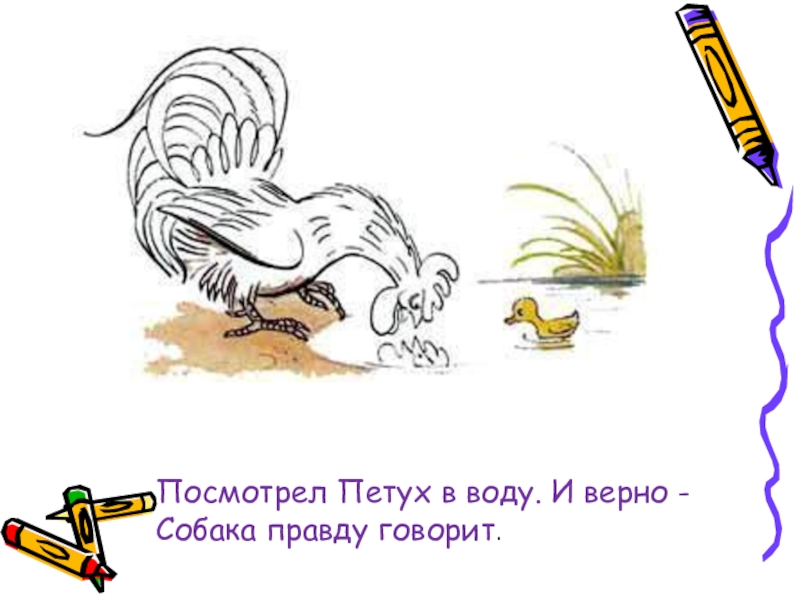 Слайд 3Посмотрел Петух в воду. И верно - Собака правду говорит.