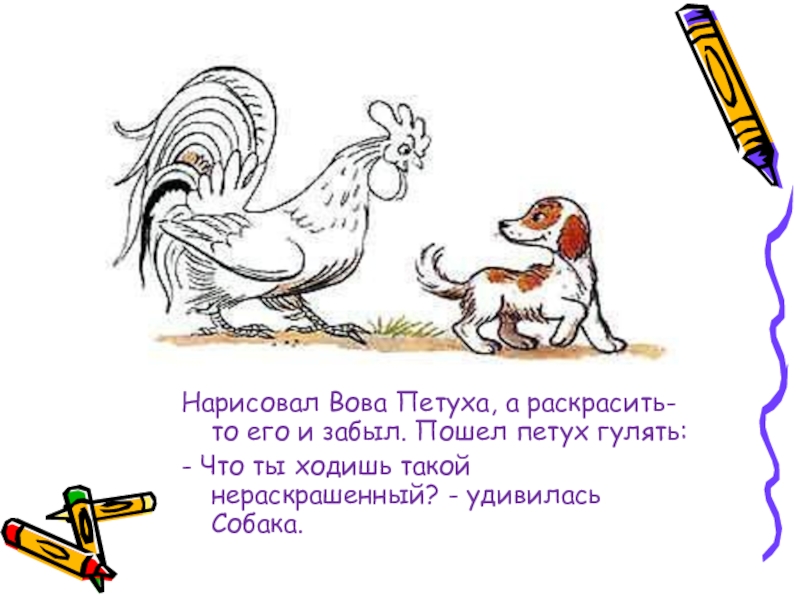 Нарисовал Вова Петуха, а раскрасить-то его и забыл. Пошел петух гулять:- Что ты ходишь такой нераскрашенный? - удивилась Собака.