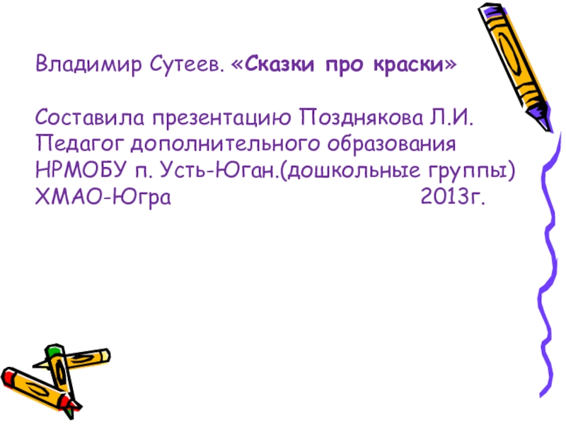 Владимир Сутеев. «Сказки про краски»Составила презентацию Позднякова Л.И. Педагог дополнительного образованияНРМОБУ п. Усть-Юган.(дошкольные группы)ХМАО-Югра