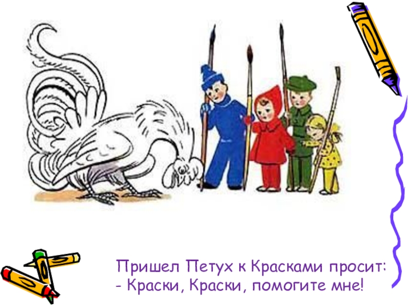 Пришел Петух к Красками просит:- Краски, Краски, помогите мне!