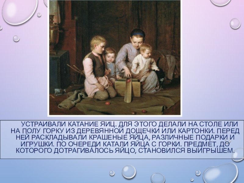 на столе или на полу горку Из деревянной дощечки или картонки. Перед ней раскладывали крашеные яйца, различные подарки и игрушки. По очереди катали яйца с горки. Предмет, до которого дотрагивалось яйцо, становился выигрышем.