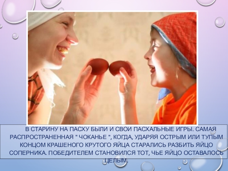 свои пасхальные игры. Самая распространенная " чоканье ", когда, ударяя острым или тупым концом крашеного крутого яйца старались разбить яйцо соперника. Победителем становился тот, чье яйцо оставалось целым.