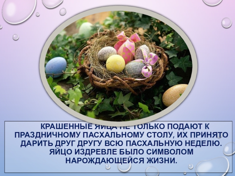 пасхальному столу, их принято дарить друг другу всю Пасхальную неделю. Яйцо издревле было символом нарождающейся жизни.
