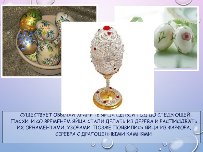 Пасхи. И со временем яйца стали делать из дерева и расписывать их орнаментами, узорами. Позже появились яйца из фарфора, серебра с драгоценными камнями.