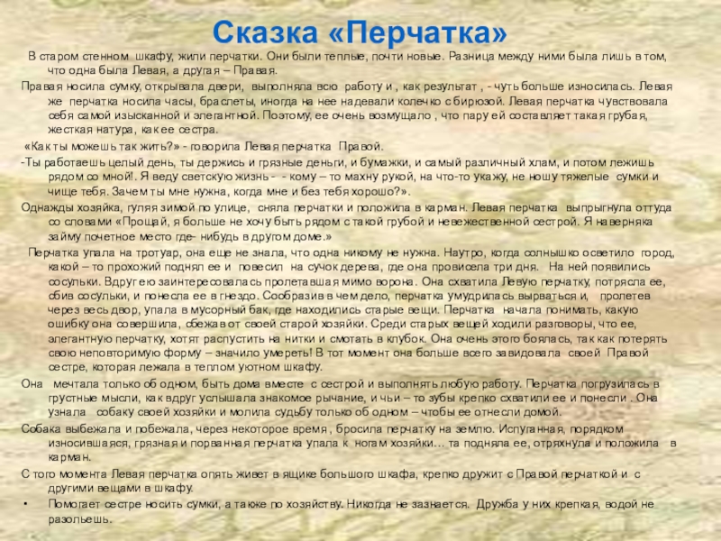 Однажды хозяйка, гуляя зимой по улице, сняла перчатки и положила в карман. Левая перчатка выпрыгнула оттуда со словами «Прощай, я больше не хочу быть рядом с такой грубой и невежественной сестрой. Я наверняка займу почетное место где- нибудь в другом доме.»